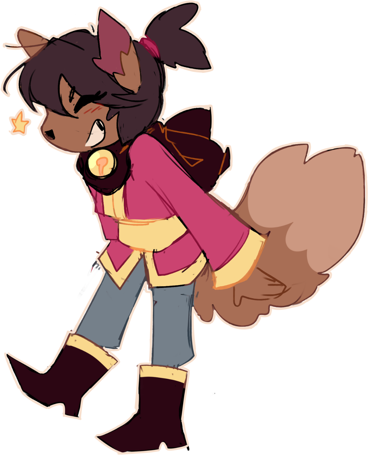 Kanako is a young kitsune monster with brown fur and a short snout. She has dark brown hair that is tied up with a red ribbon. She has a small, magenta kimono with gold trim and a gold obi sash tied around her waist. The kimono is short, showing she wears long grey pants and small boots. She has a red scarf with a golden bell, similar to Ceroba's hair tie. Despite never being shown in-game, Kanako, like her father, has a tail.